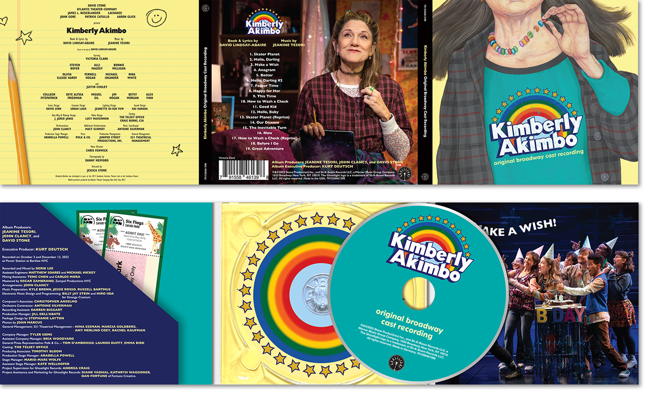 When I designed the packaging for Kimberly Akimbo I was sent the show’s key art (an illustration by Canadian painter Anita Kunz), a folder of production photos, and a lot of text. Kim tells the story of a 16-year-old girl with a rapid-aging disease, so I decided to design a package that a teen girl in the 90s might love. It was so much fun to create doodles, zoo tickets, stickers, and numerous little show references or details that you might find in a teen’s notebook.